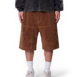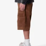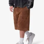 Constructed from 100% polyester faux suede, the Baggy Suede Work Shorts feature a baggy silhouette with utility-inspired design. Built with a multi-panel patchwork construction, the shorts are detailed with topstitching and rivets throughout.