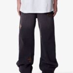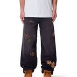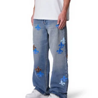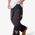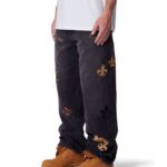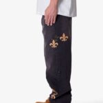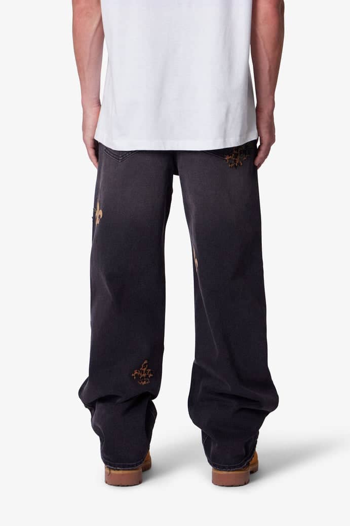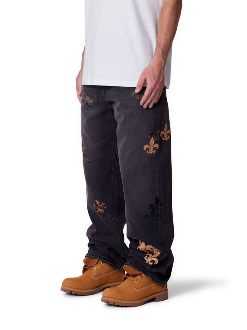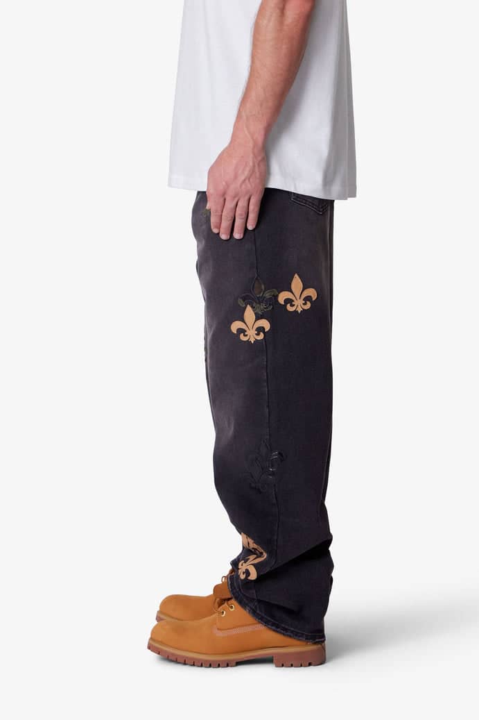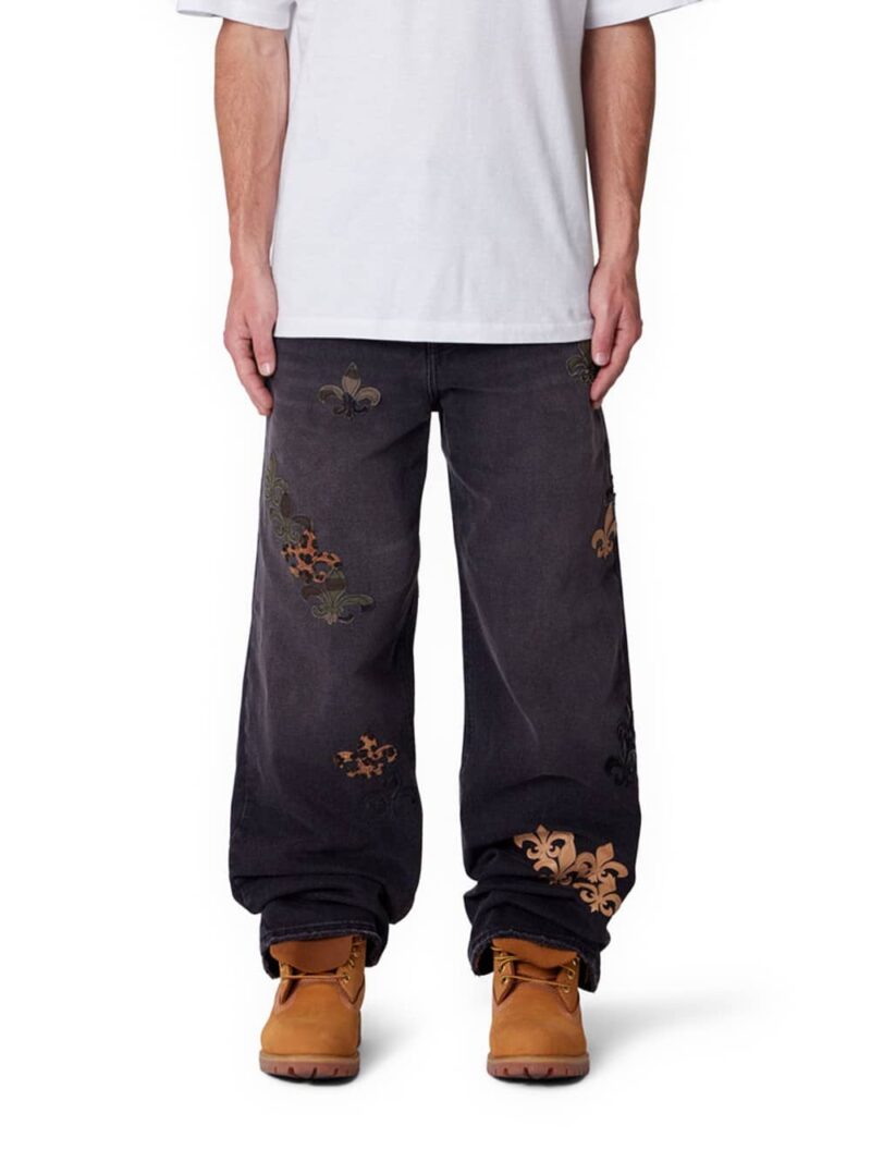 Constructed from 100% cotton denim in a vintage black wash, the Ultra Baggy Fleur Denim features a relaxed fit with sanding and light whiskering for a worn-in effect. Distressed leg openings add additional vintage character, while multicolor faux leather fleur de lis appliqués are placed throughout the garment. Finished with a button fly, metal hardware, and classic five-pocket construction.